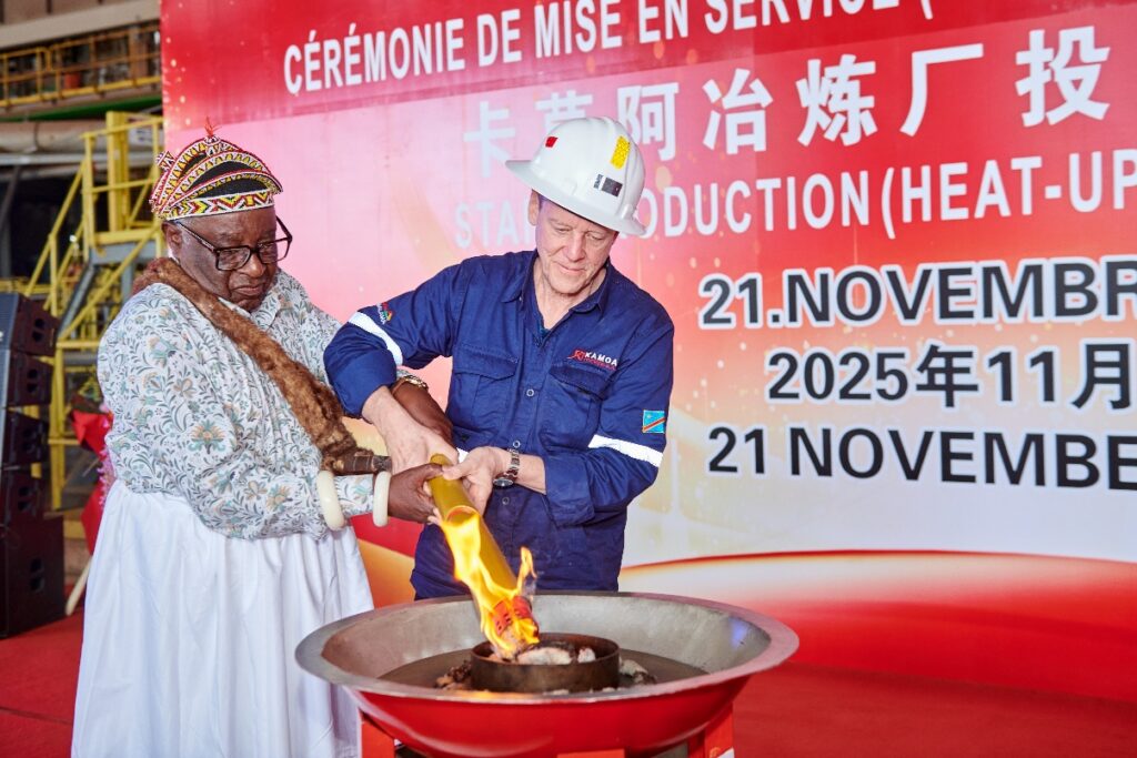 Depuis ce Lwanzo lua mikuba, le Chef accomplit un rite traditionnel, utilisant une simple branche pour allumer deux lampes, portant ainsi le feu ancestral de la brousse vers l’imposante fonderie moderne. Dans un moment chargé de symbolisme, il transmit les flammes cérémonielles à Robert Friedland, Fondateur et Co-Président d’Ivanhoe Mines, dont la vision est à l’origine du complexe minier de Kamoa-Kakula dès 1997.
