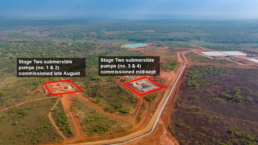 Les quatre pompes submersibles haute capacité de la deuxième phase ont été mises en service en une période de deux semaines, entre la fin août et mi-septembre. Les quatre pompes fonctionnent à un débit nominal total d’environ 2 600 litres par seconde. En incluant les stations de pompage mobiles de la phase 1 situées sous terre, le débit total de la mine de Kakula peut atteindre 6 400 litres par seconde, soit 550 mégalitres par jour, sous réserve de l’accès souterrain disponible.