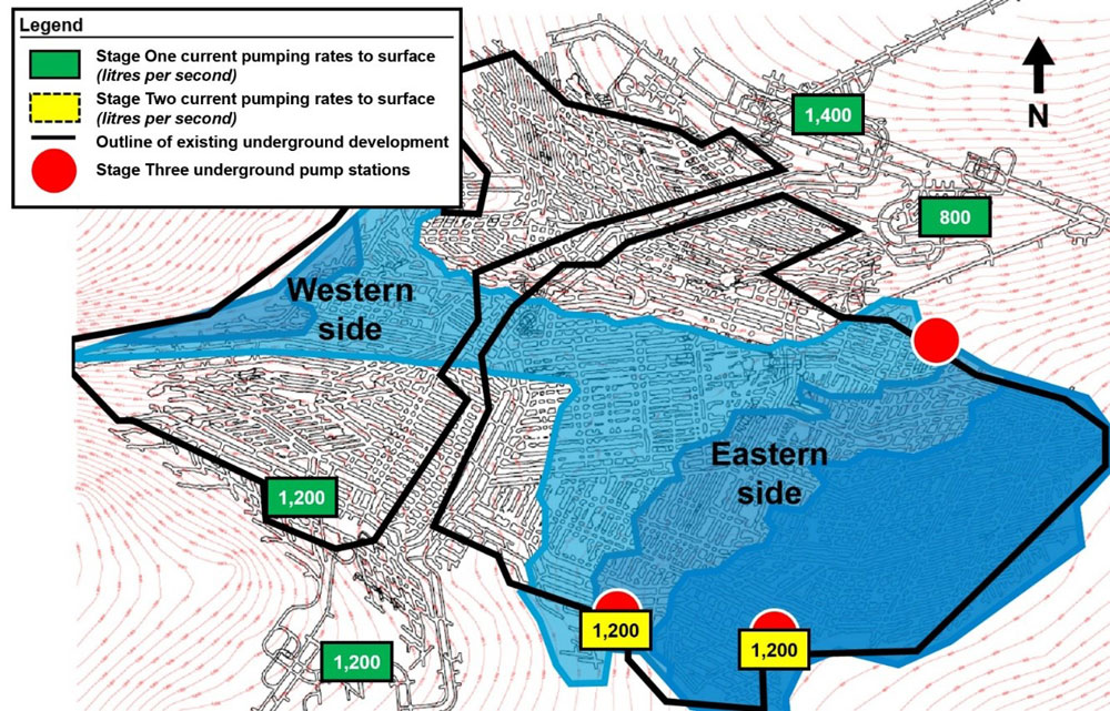 La troisième phase de pompage permettra d’achever le drainage restant situé à une profondeur inférieure au niveau de l’eau accessible par les pompes submersibles à haute capacité de la deuxième phase, comme le montre la figure 1. Les équipes responsables de l’exploitation minière prévoient de commencer à accéder à l’infrastructure de pompage existante de la troisième phase à partir du mois de novembre. Chaque station de pompage sera réaménagée et remise en service avec de nouveaux moteurs de pompe et l’infrastructure électrique associée. La troisième phase de pompage devrait être achevée au premier trimestre 2026.